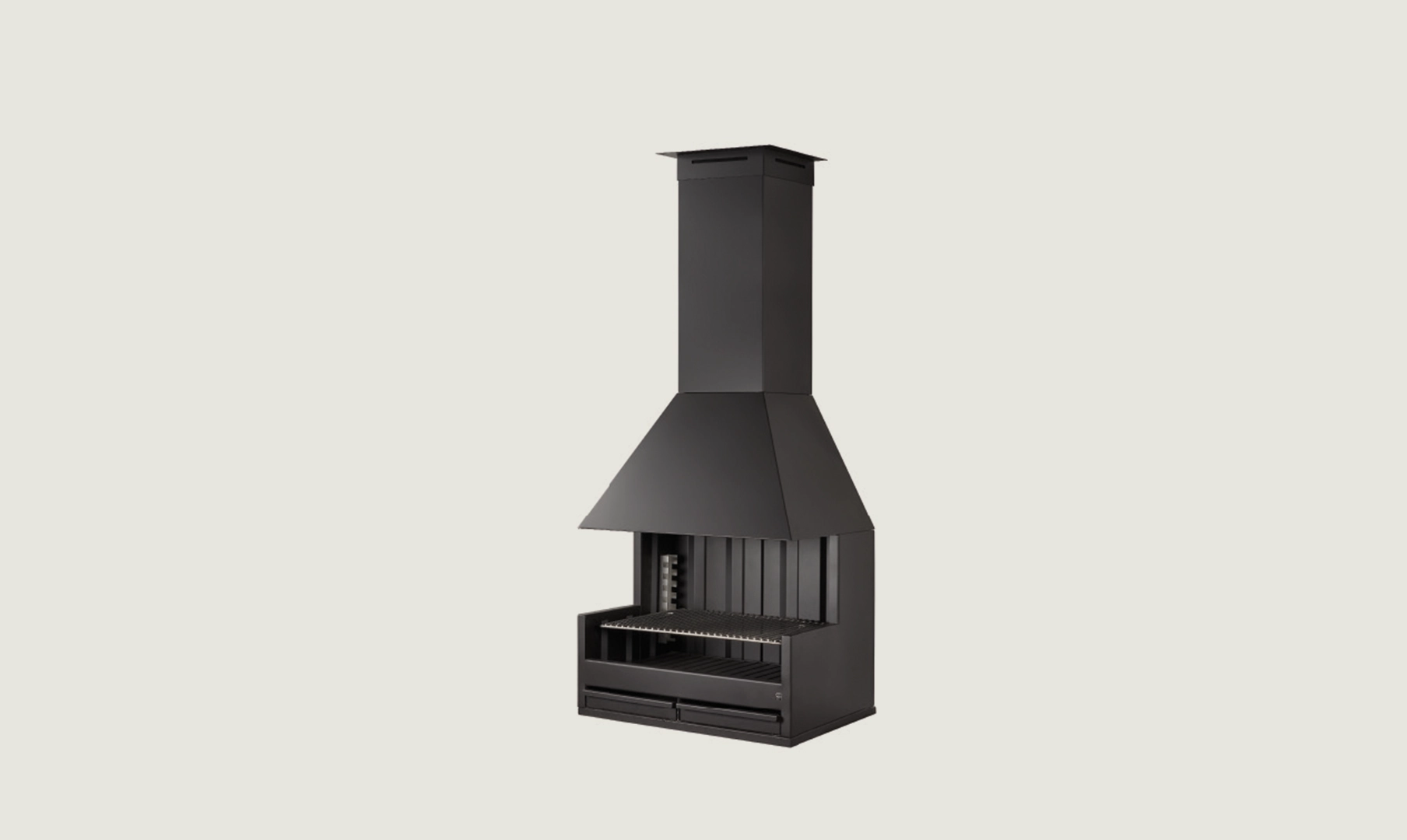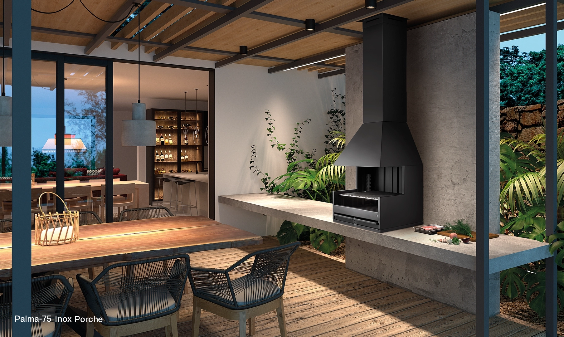 Realizzata in acciaio inossidabile, la Palma 75 garantisce affidabilità per durare tutta la vita. Questo barbecue progettato per essere posizionato su un portico risulta ideale per cucinare in spazi esterni coperti, consentendo una buona evacuazione dei fumi e un ottimo controllo del fuoco.[Barbacoa Palma 75 inox porche de Rocal negra, en una pared lisa gris en porche con techo de madera]