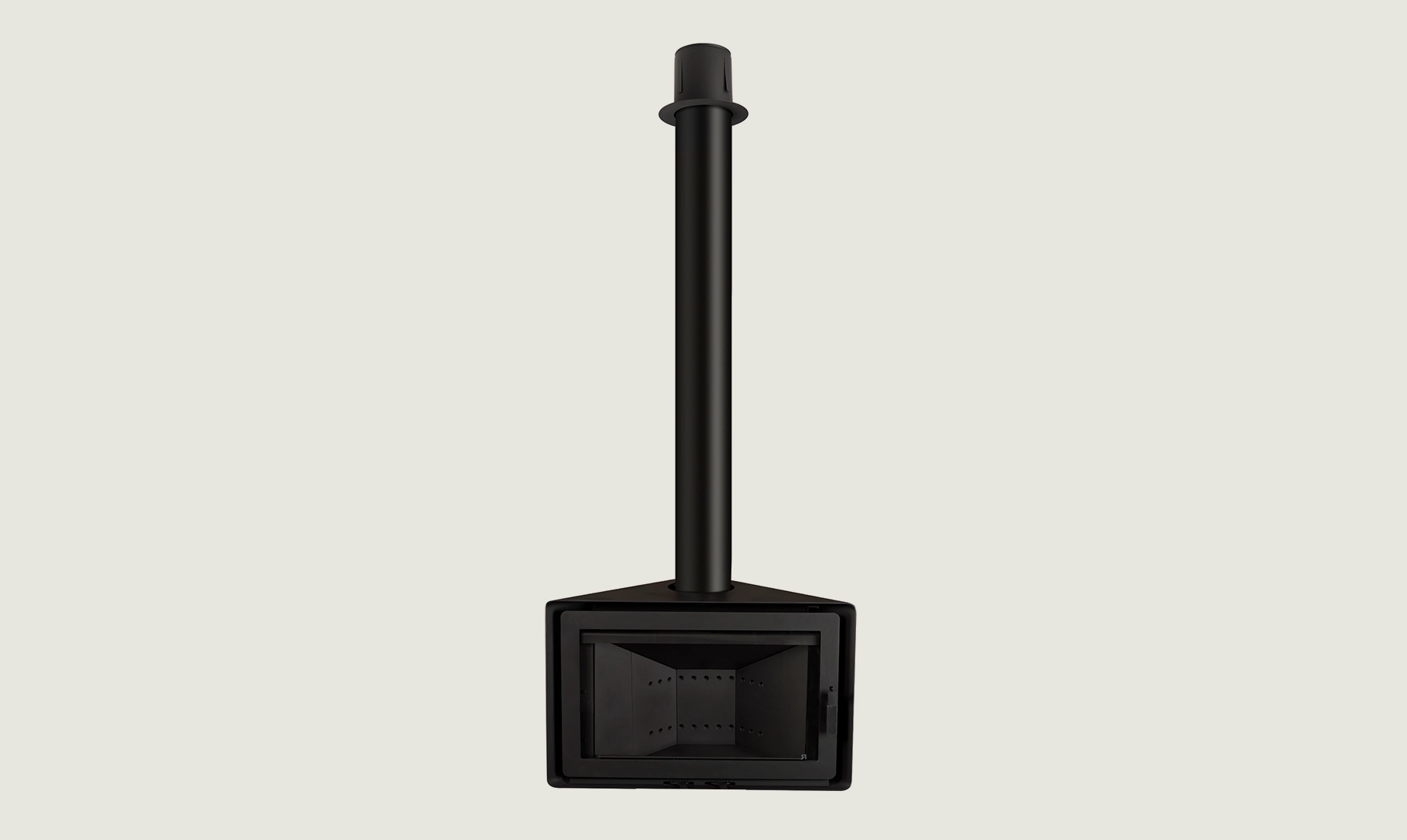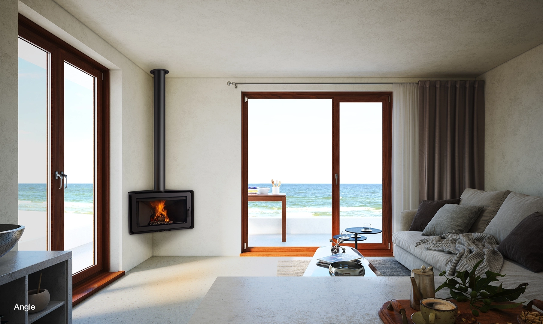 L’Angle è un modello che può essere installato in un angolo o su una parete frontale. La sua porta panoramica permette di ammirare la sua efficiente combustione e di controllare il fuoco con precisione grazie ai suoi registri frontali.[Chimenea Angle de Rocal negra, de forma triangular, en esquina de una pared con vistas al mar]