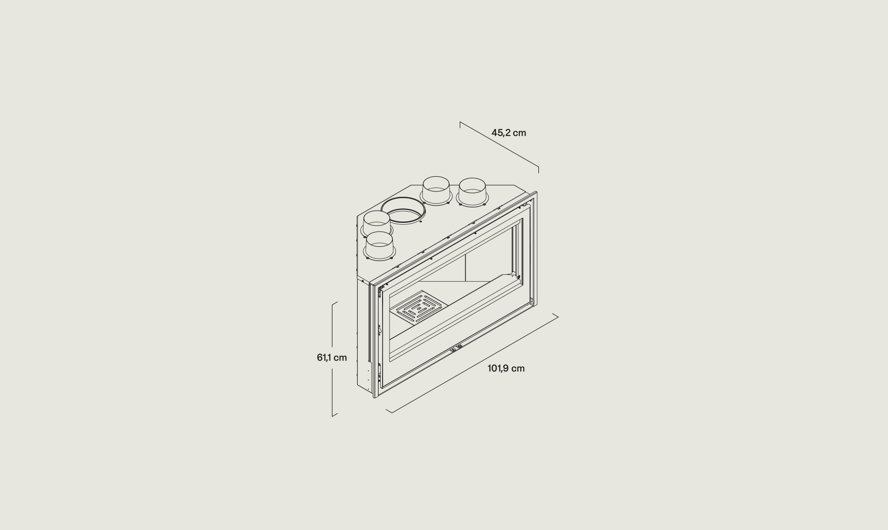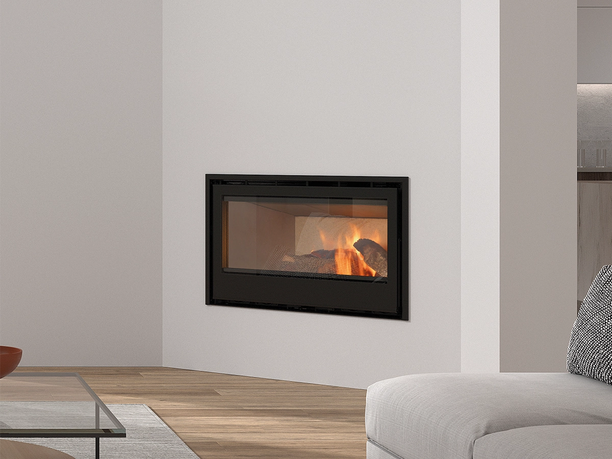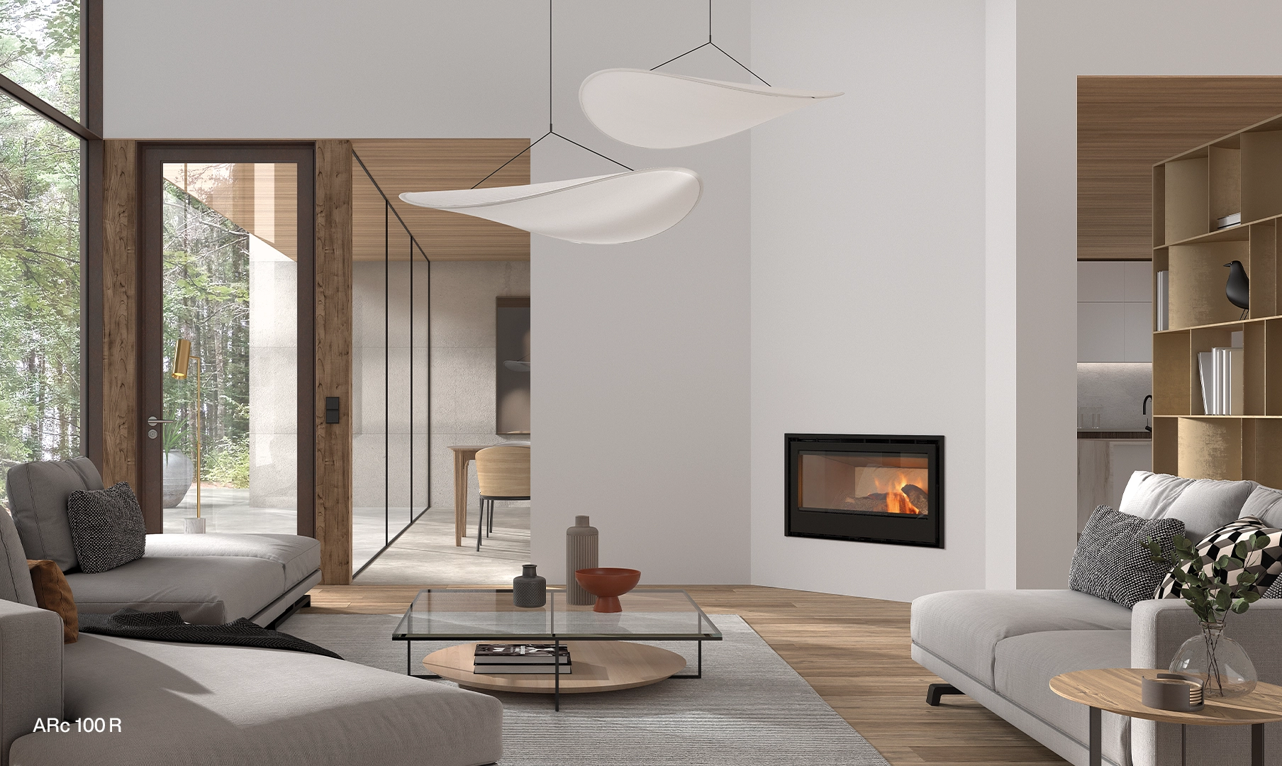 L'ARc 100 R è progettato per integrarsi perfettamente in caminetti angolari esistenti o di nuova costruzione. Questo inserto permette di portare il fuoco in un angolo della casa, offrendo un'elevata resa termica grazie alle serrande primarie e secondarie, che distribuiscono il calore in modo ottimale, garantendo una temperatura ideale.[Inserire l'unità angolare ARc 100 R di Rocal in nero, con camino integrato, incassata in una parete angolare bianca liscia, in un soggiorno dai toni chiari.]