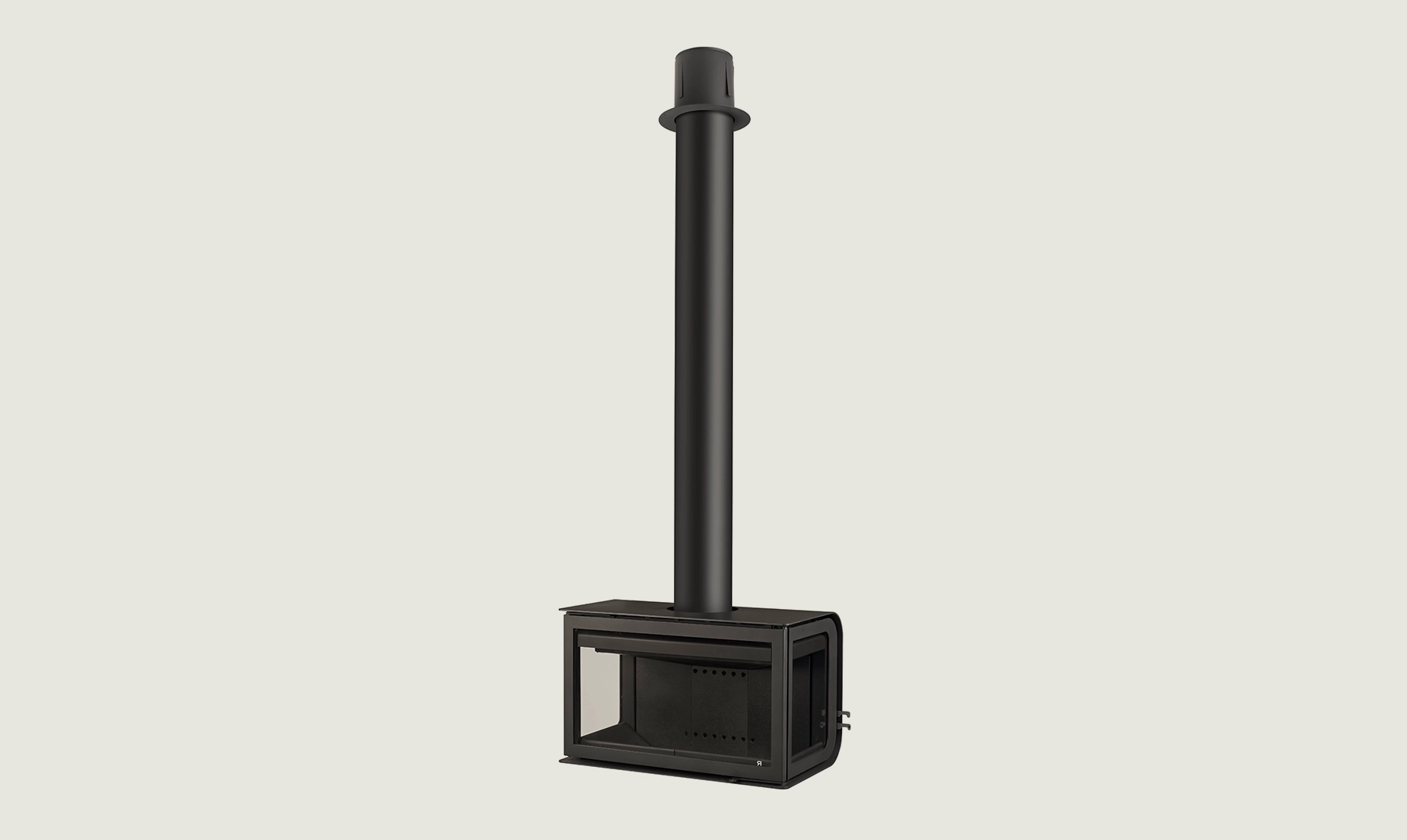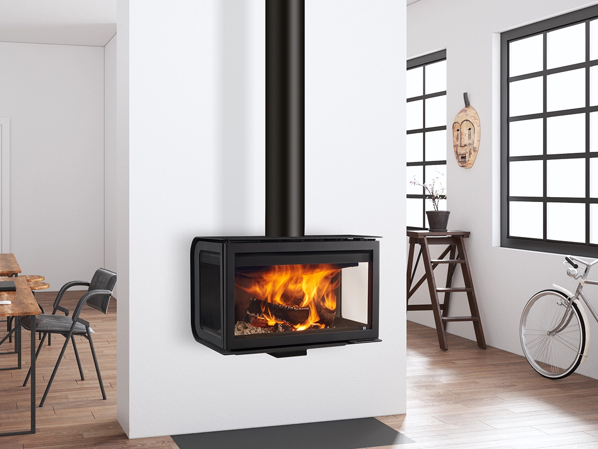 City è il caminetto ideale per spazi urbani moderni ed eleganti. Offre una visibilità completa del fuoco e ha una grande capacità di legna, garantendo una combustione di qualità in ogni occasione.[Caminetto Black Rocal City, di forma rettangolare, con fuoco all'interno, su una parete liscia in un ambiente luminoso.