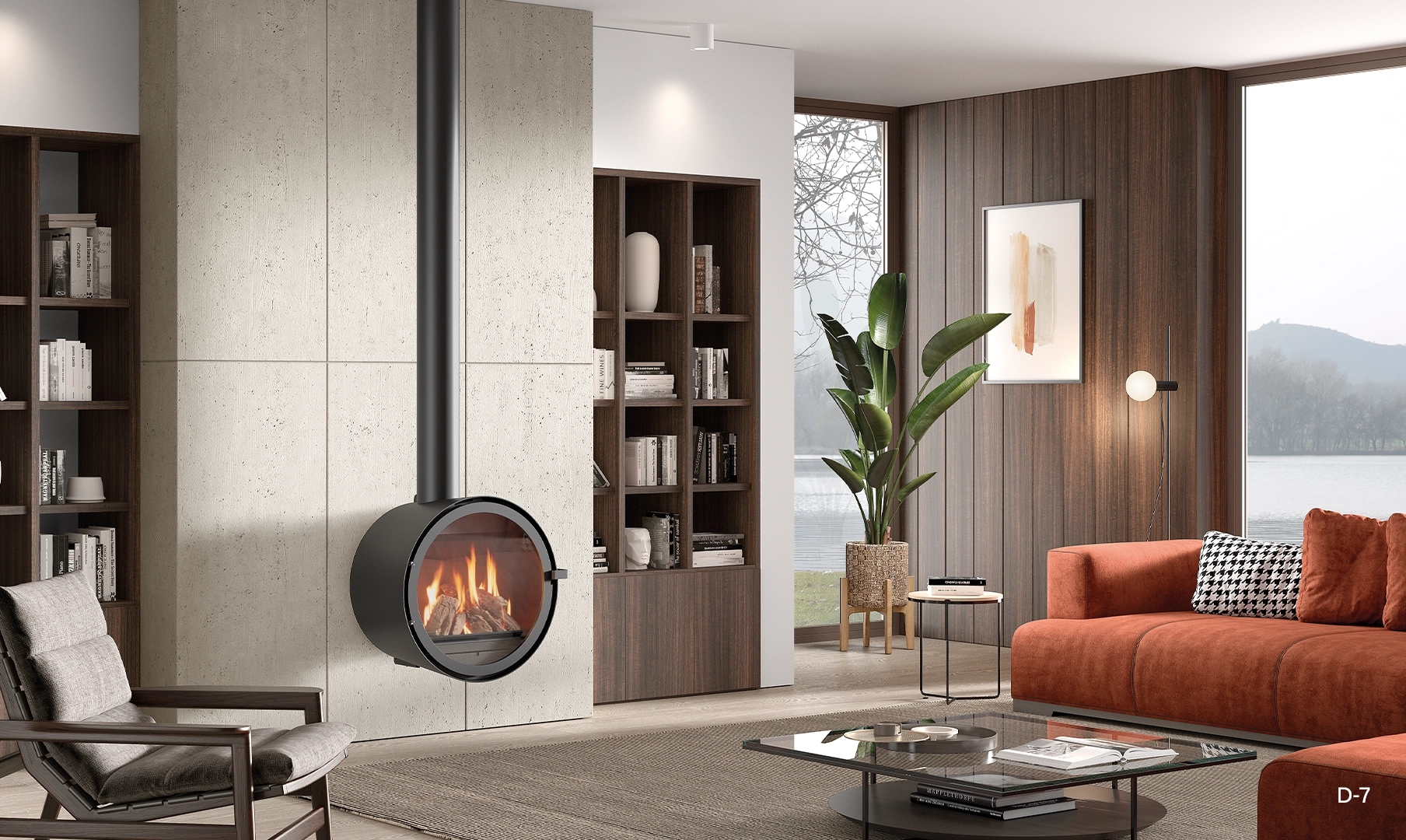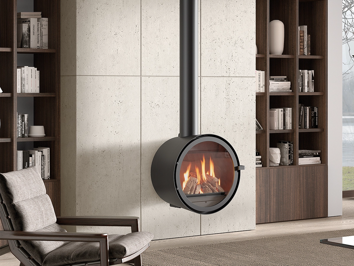 Grazie alle sue dimensioni ideali e alla sua splendida estetica, il D-7 è uno dei caminetti moderni più ricercati. Si integra perfettamente nelle case in cui il design è fondamentale.[Caminetto Rocal D-7 nero, rotondo, senza base, con fiamma interna, su una parete di cemento accanto a una libreria.]