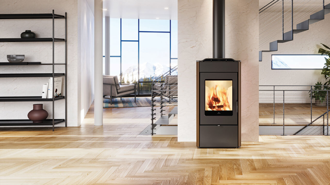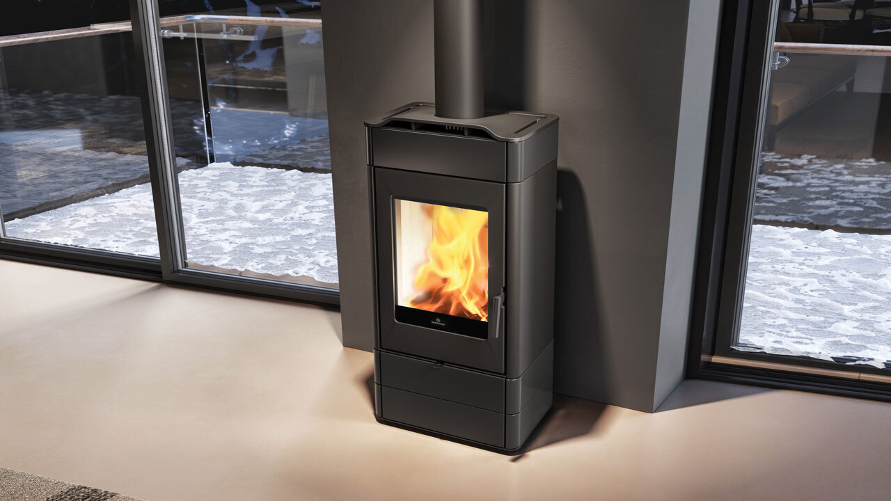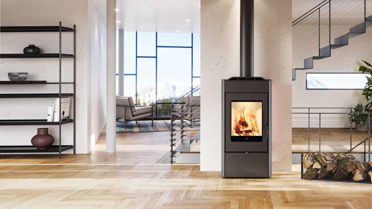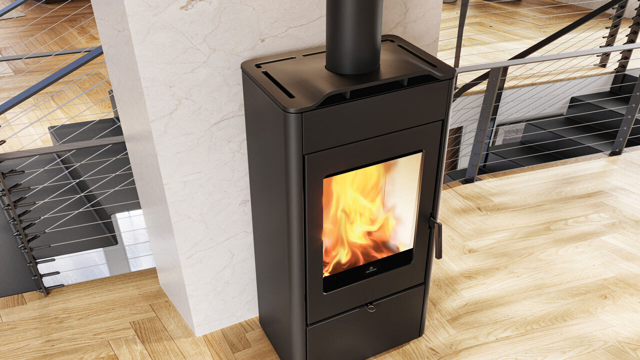 Stufa a legna rettangolare canalizzabile tramite kit optional, profondità ridotta (40 cm). Porta e top in ghisa con griglia di ventilazione integrata.