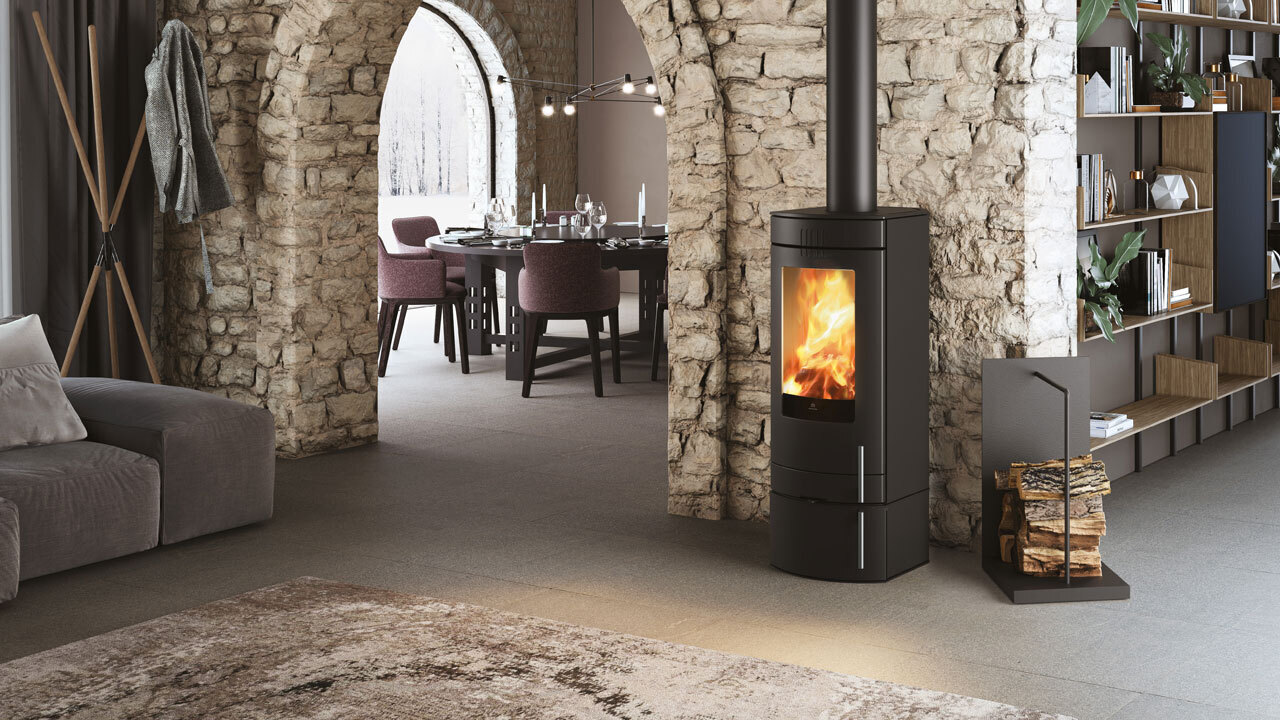 Stufa a legna caratterizzata da due ante, focolare e vano porta oggetti, con maniglia inox.