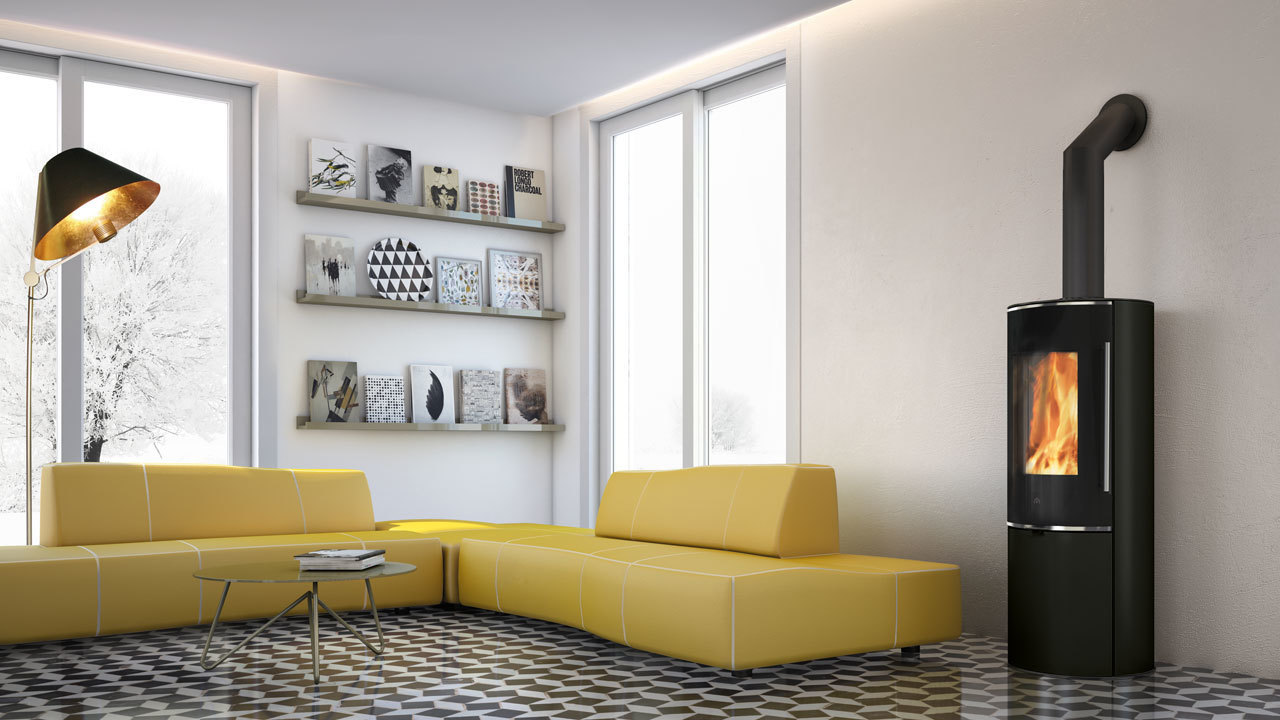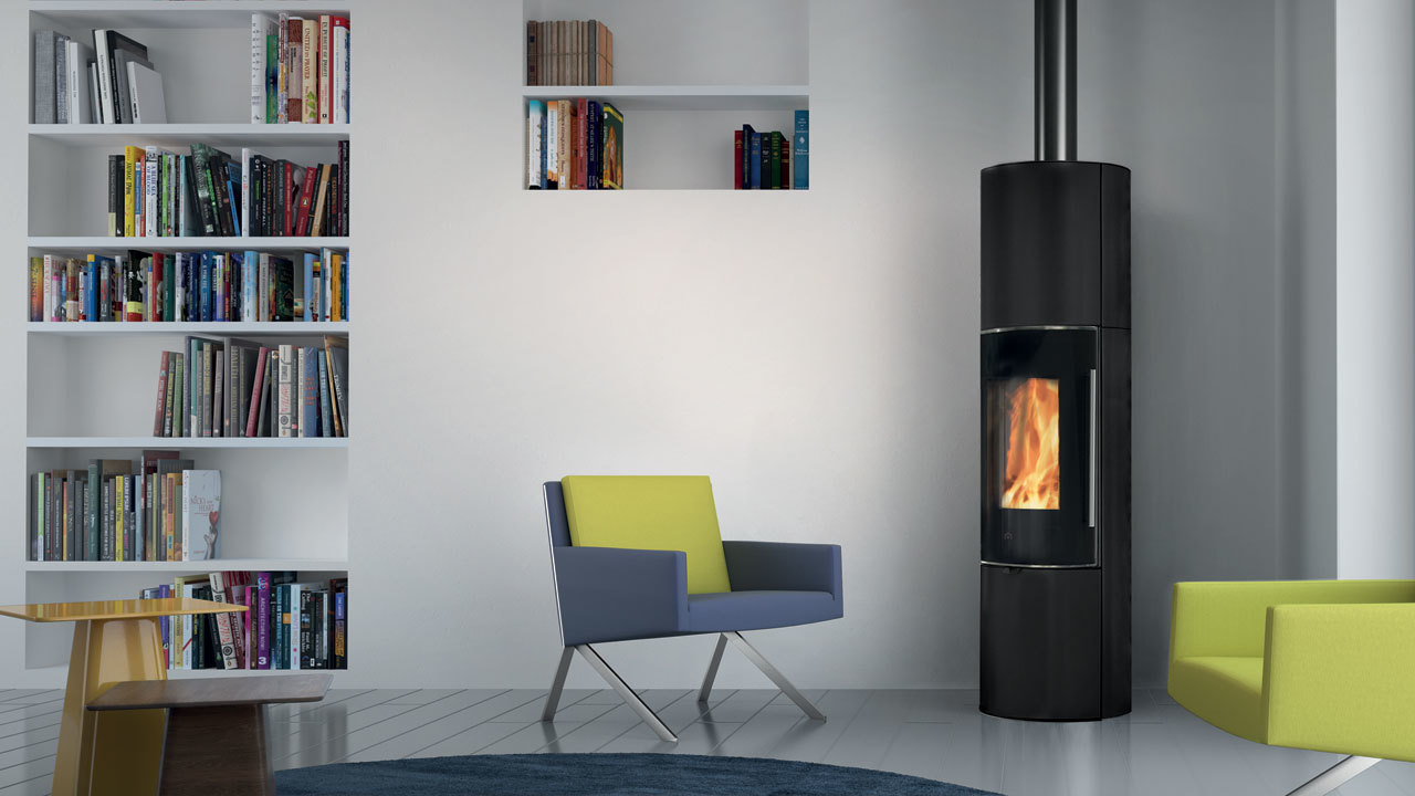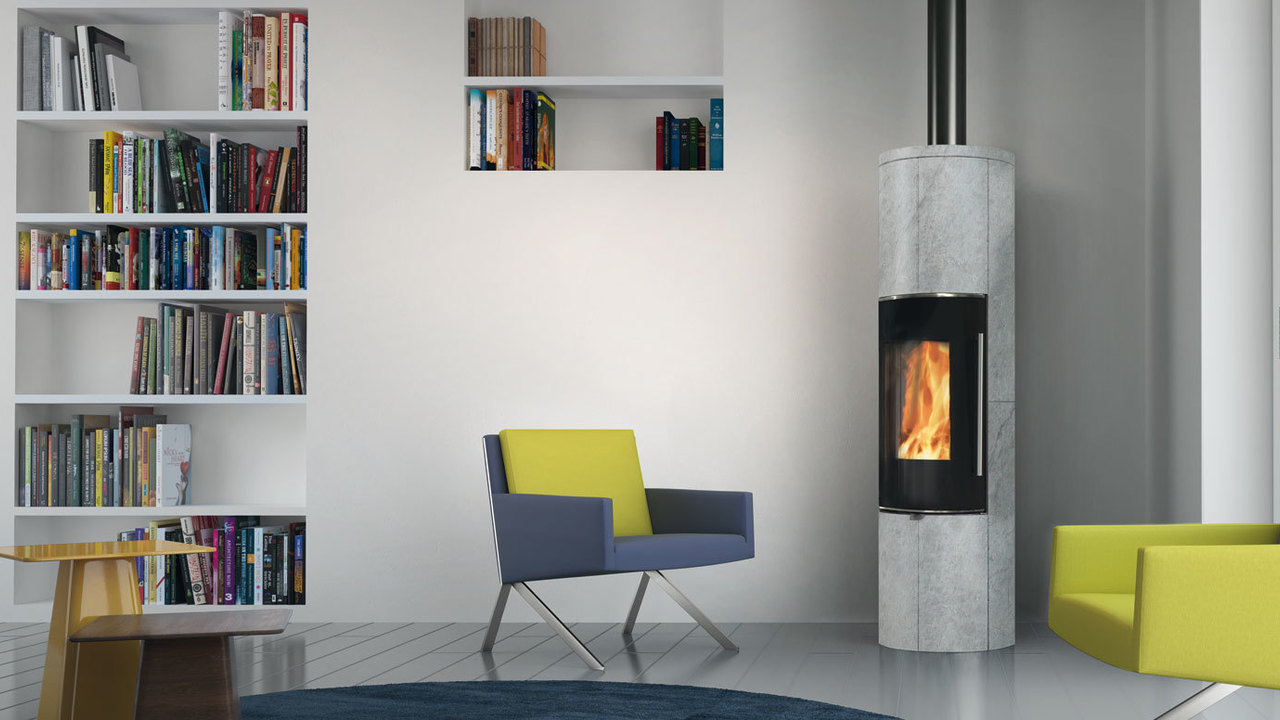 Stufa a legna Tally GL Evo2, con ampio vetro tondo che esalta la visione della fiamma. Tally GL Evo2 è predisposta per accumulo con kit optional: il top con anelli refrattari consente di accumulare calore e rilasciarlo in maniera prolungata anche nelle ore successive all’ultima carica di legna.
