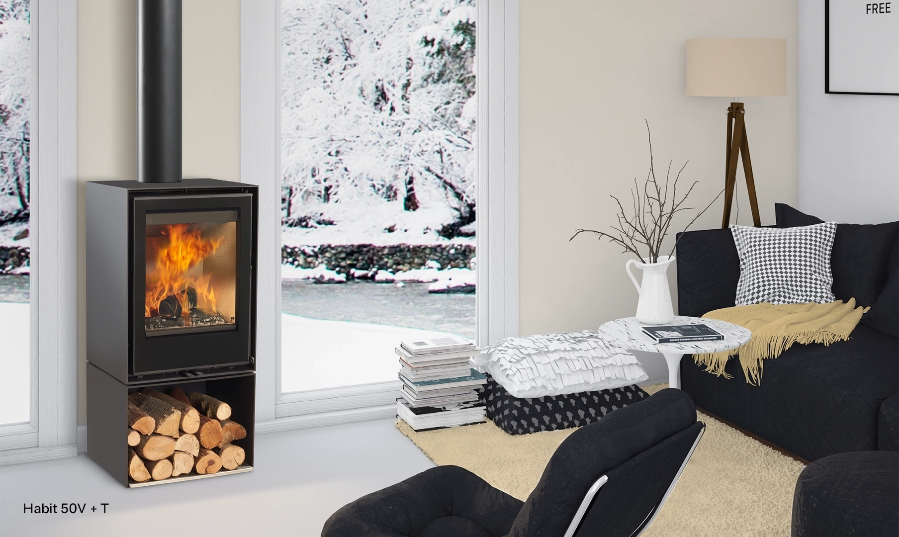L’Habit è una stufa dallo stile moderno estremamente pratica, funzionale ed elegante. Con un’ampia vista del fuoco e un alto rendimento, ti permette di scegliere il suo design: con base per la legna, panca metallica o sospesa a parete.[Estufa Habit 50V Frontal de Rocal negra con fuego dentro y leña en la parte inferior en pared al lado de ventanales en salón de tonos claros]