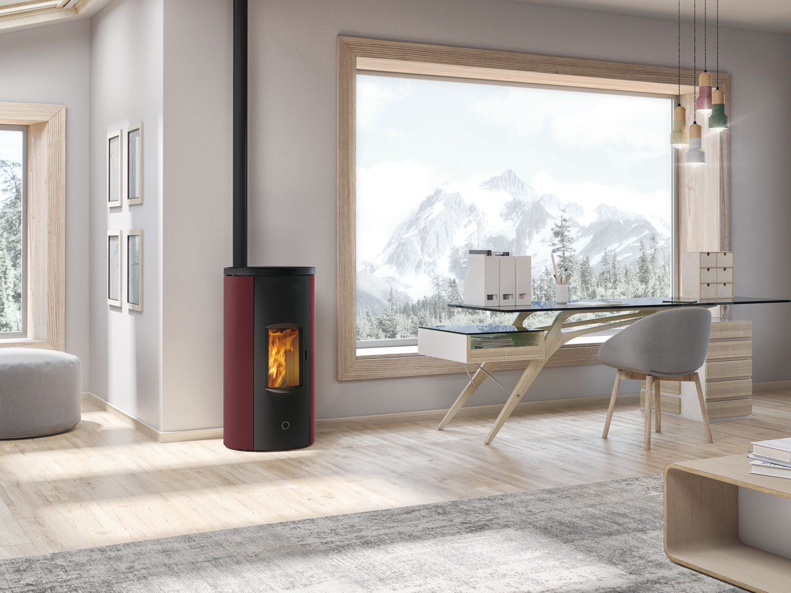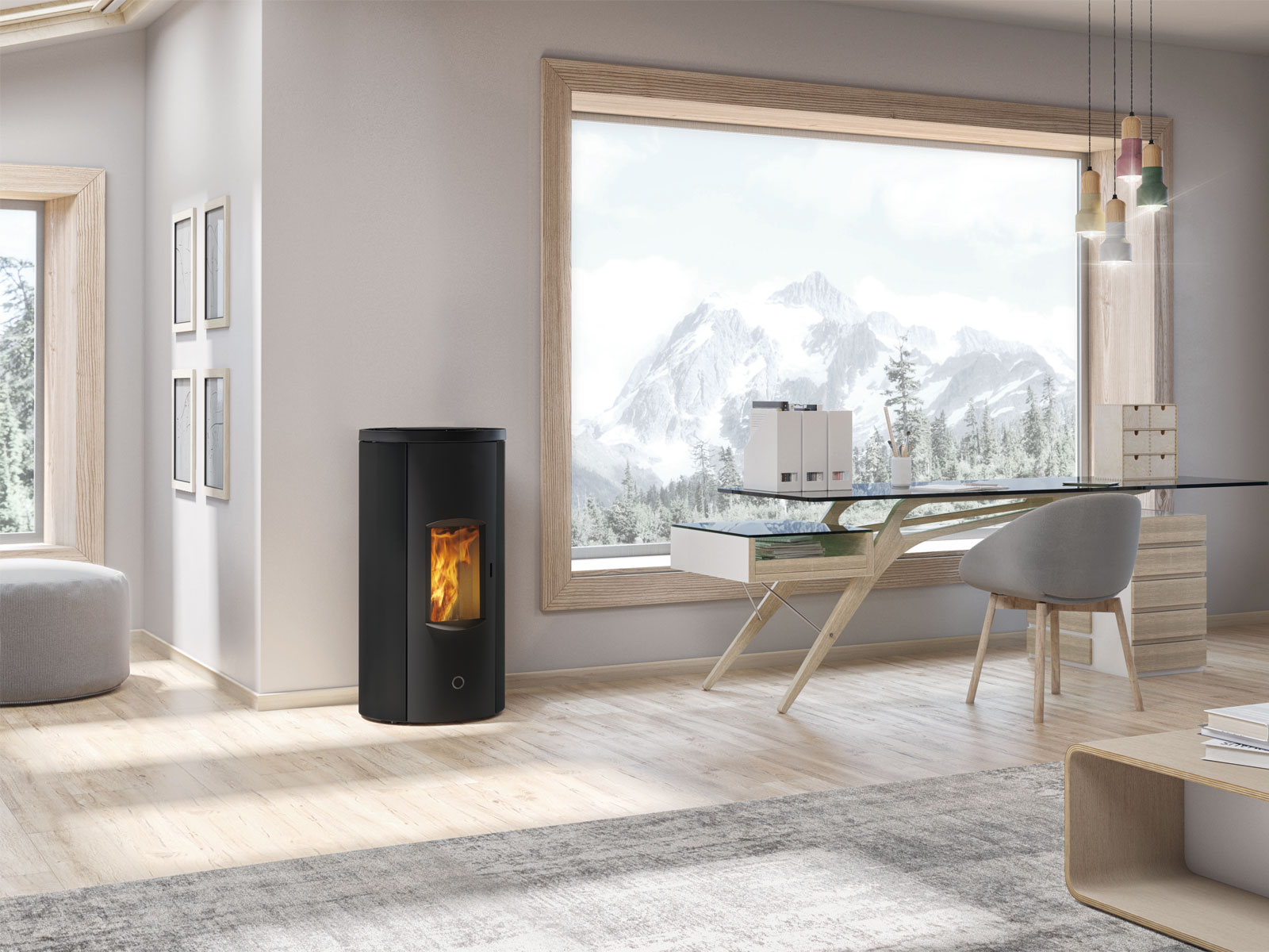 Stufa a pellet stagna a sezione rotonda con porta curva in acciaio e vetro piano. La porta, priva di griglie, e i fianchi presentano decorazioni in bassorilievo.