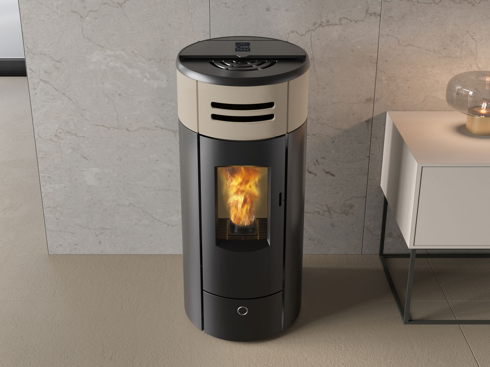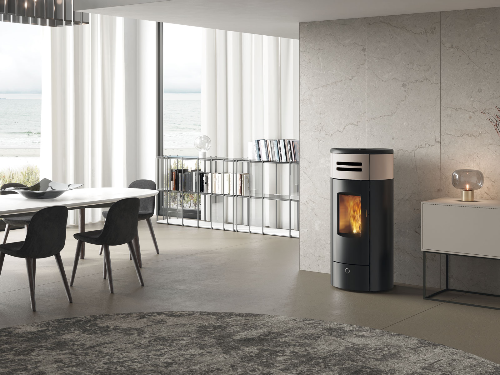 Stufa a pellet stagna canalizzabile a sezione rotonda, dalla linea slanciata. Con porta in ghisa, fianchi in acciaio e inserto frontale in ceramica.