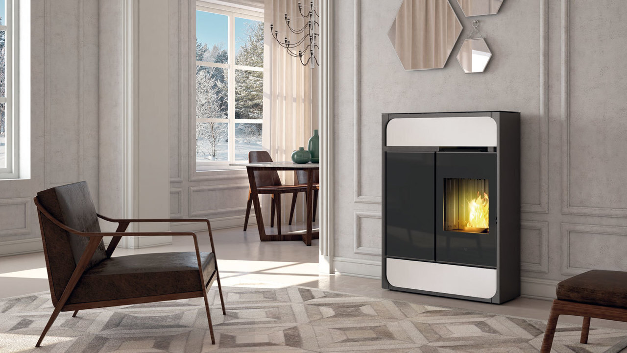 La stufa a pellet Bild è particolarmente compatta, profonda solo 30 cm. Progettata per il corridoio, è adatta a qualsiasi zona della casa. Bild possiede ventilatori gestibili separatamente tramite radiocomando, per creare un comfort su misura in locali diversi. Inoltre, è possibile deviare manualmente l'aria canalizzata, erogandola completamente nel locale dove è installata la stufa. Inoltre, l'aria calda frontale è disattivabile per il massimo comfort. Per chi ama il design più rigoroso, Bild con maniglia mano-fredda: si usa solo quando serve. Per chi ama la comodità, maniglia FIT optional: una volta agganciata, diventa fissa.