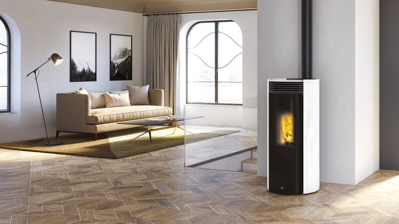 Stufa a pellet dal design essenziale e raffinato. Il vetro “Magic” totalmente nero rende visibile la fiamma ma nasconde il focolare quando è spento, per un design sempre elegante.