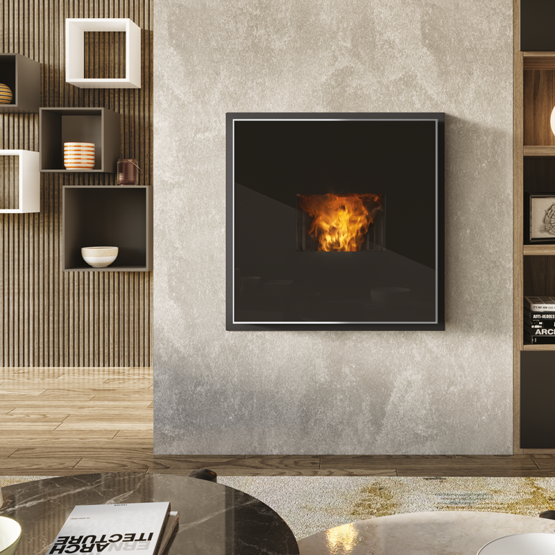 Termocamino a pellet con vetro “Magic” totalmente nero che rende visibile la fiamma ma nasconde il focolare quando è spento, per un design sempre elegante.