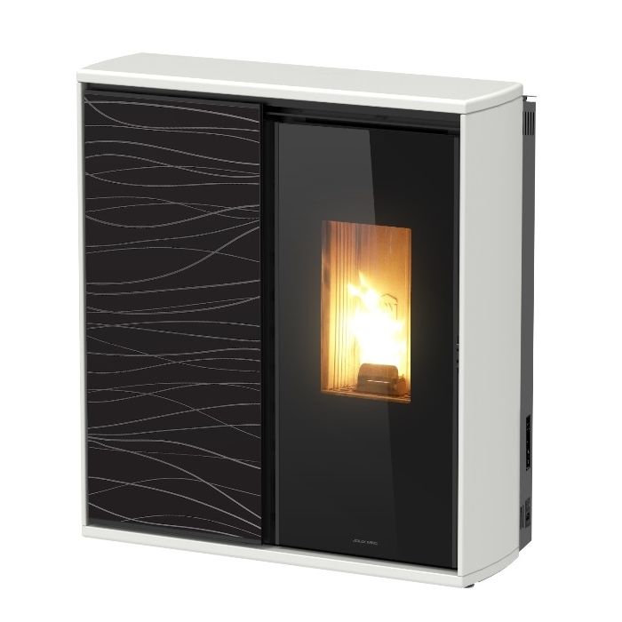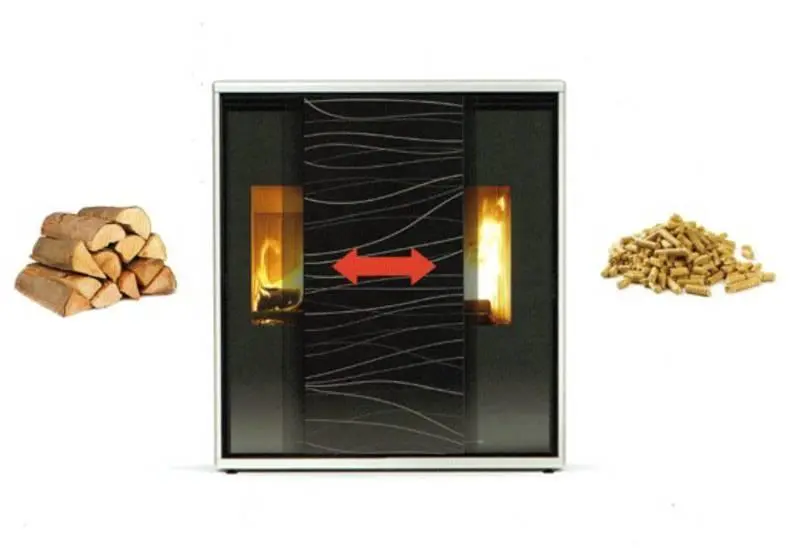 Una stufa combinata compatta funzionante a legna ed a pellet, per il riscaldamento ad aria calda forzata, con la particolarità di due camere di combustione, ma una sola uscita fumi e dal design unico che valorizza la fiamma del combustibile scelto. Un vetro esterno scorrevole decorato o liscio, completa l’effetto scenografico della stufa permettendo di oscurare o dare visione alla fiamma in qualsiasi momento. La rifinitura esterna è disponibile in pietra ollare sabbiata o acciaio in colorazioni bianco o nero. Con il funzionamento a legna puoi scegliere anche il funzionamento solo per irraggiamento.