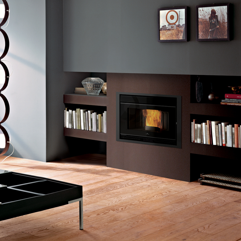L’inserto è disponibile con due modalità di caricamento pellet: cassetto frontale o botola con scivolo.