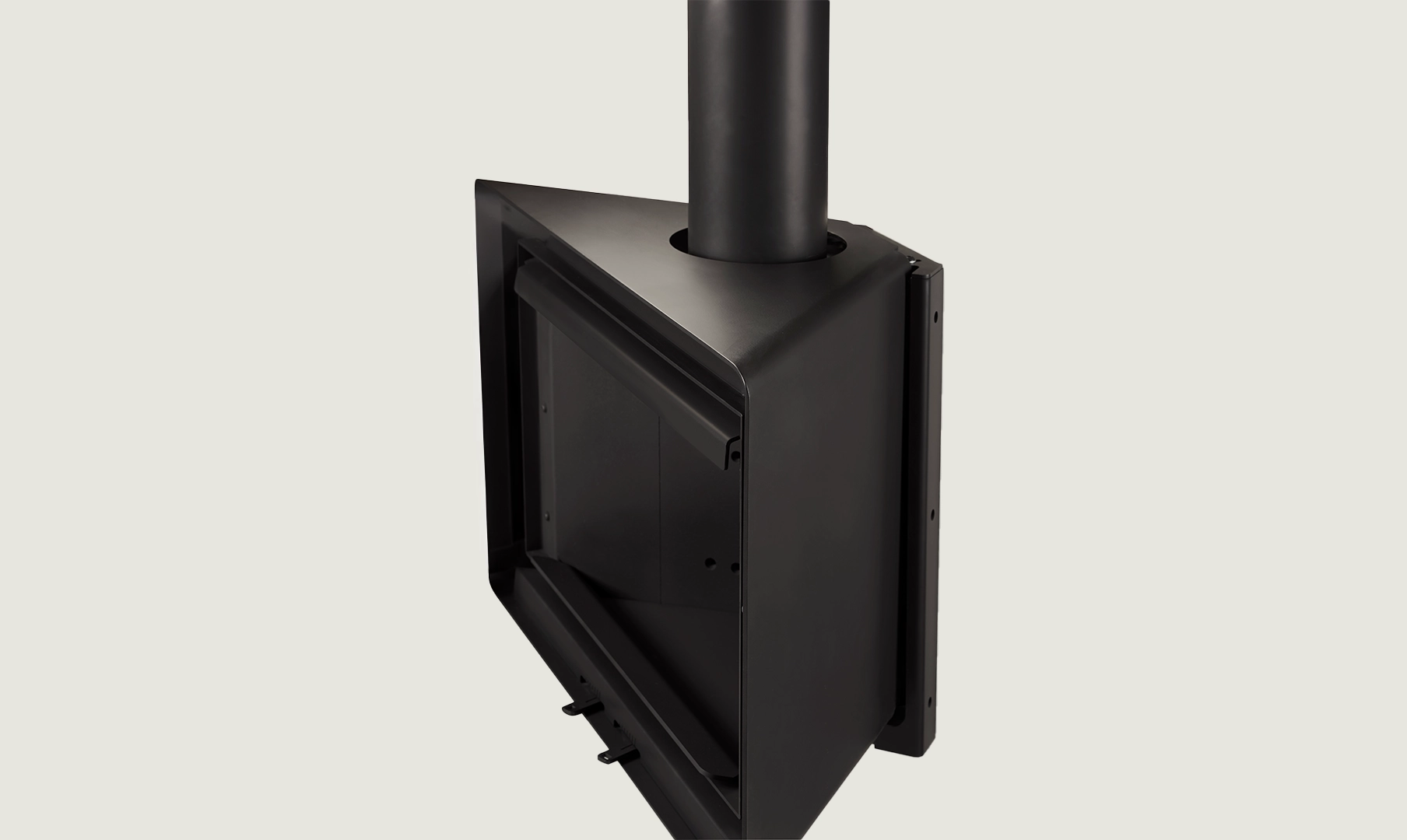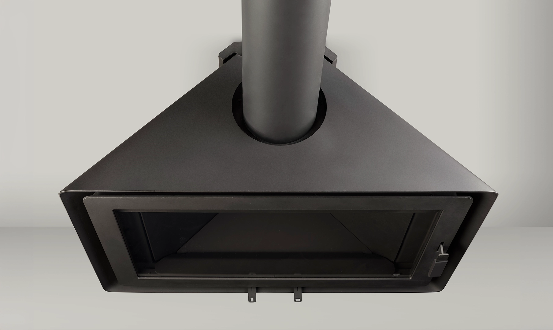 L’Angle è un modello che può essere installato in un angolo o su una parete frontale. La sua porta panoramica permette di ammirare la sua efficiente combustione e di controllare il fuoco con precisione grazie ai suoi registri frontali.[Chimenea Angle de Rocal negra, de forma triangular, en esquina de una pared con vistas al mar]