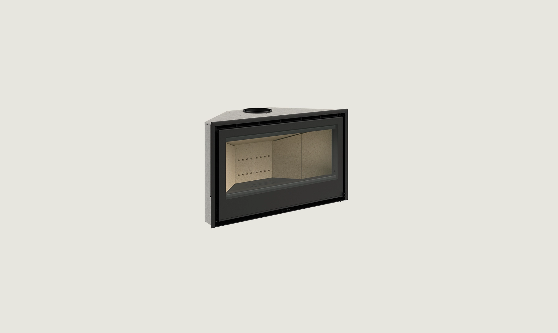 L'ARc 100 R è progettato per integrarsi perfettamente in caminetti angolari esistenti o di nuova costruzione. Questo inserto permette di portare il fuoco in un angolo della casa, offrendo un'elevata resa termica grazie alle serrande primarie e secondarie, che distribuiscono il calore in modo ottimale, garantendo una temperatura ideale.[Inserire l'unità angolare ARc 100 R di Rocal in nero, con camino integrato, incassata in una parete angolare bianca liscia, in un soggiorno dai toni chiari.]