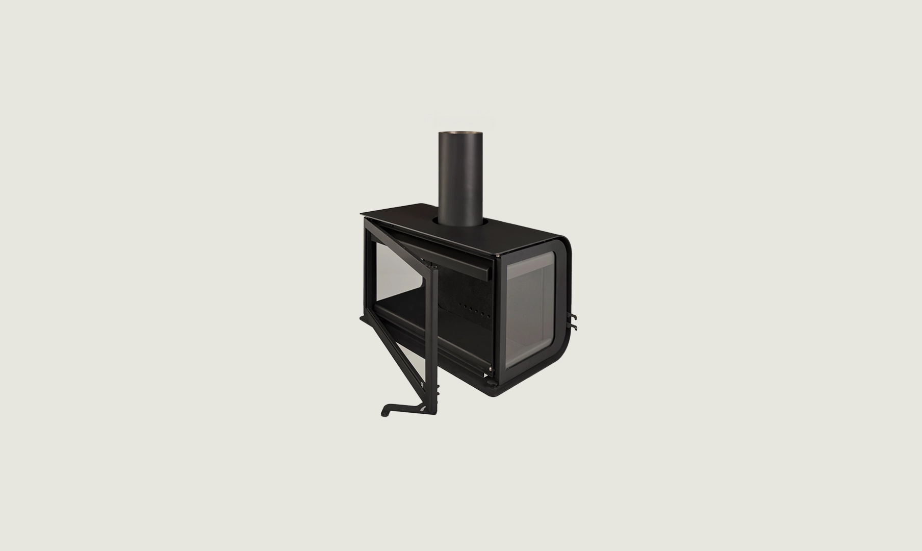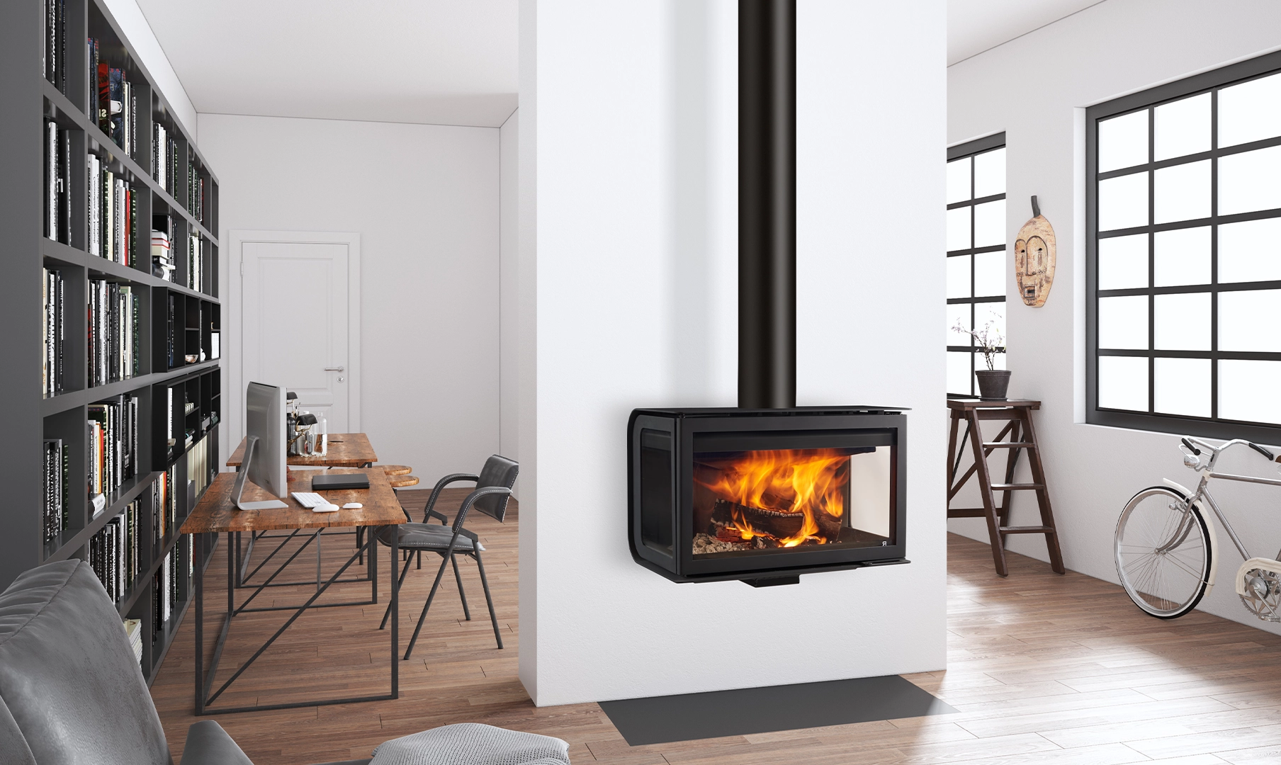 City è il caminetto ideale per spazi urbani moderni ed eleganti. Offre una visibilità completa del fuoco e ha una grande capacità di legna, garantendo una combustione di qualità in ogni occasione.[Caminetto Black Rocal City, di forma rettangolare, con fuoco all'interno, su una parete liscia in un ambiente luminoso.
