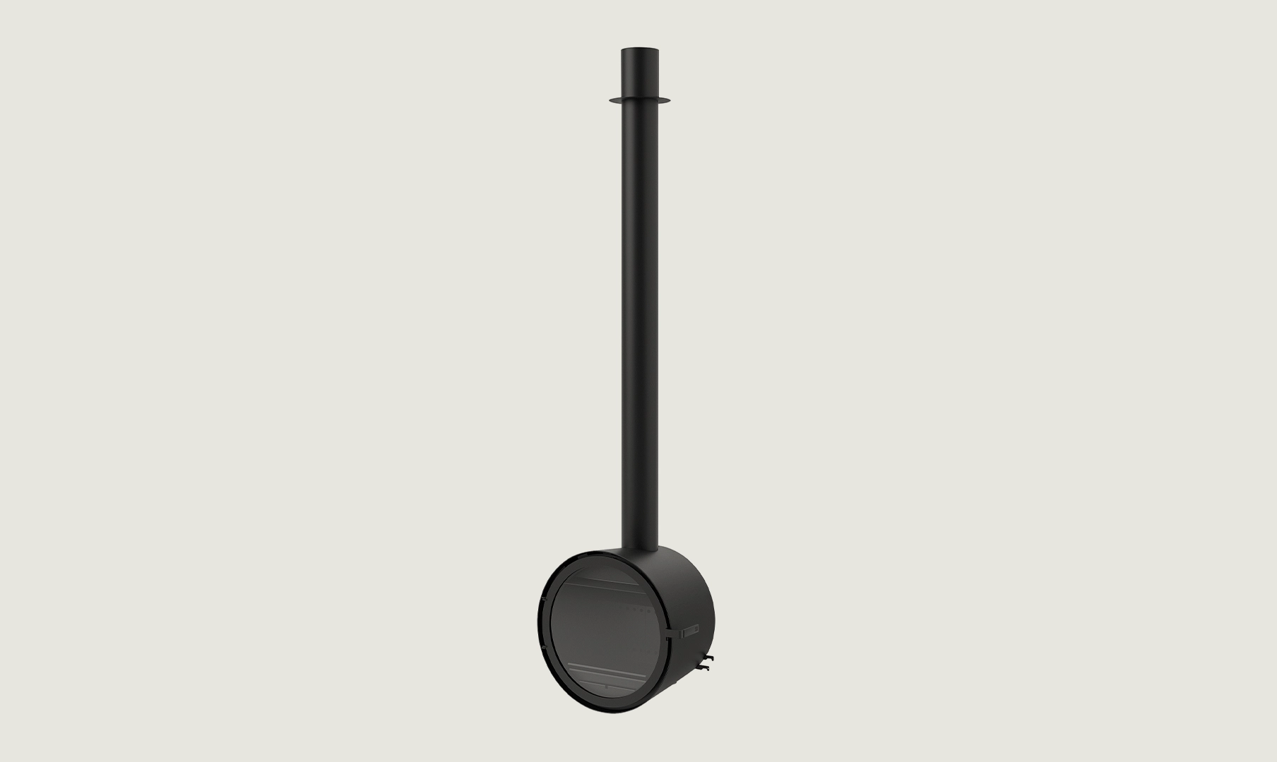 Grazie alle sue dimensioni ideali e alla sua splendida estetica, il D-7 è uno dei caminetti moderni più ricercati. Si integra perfettamente nelle case in cui il design è fondamentale.[Caminetto Rocal D-7 nero, rotondo, senza base, con fiamma interna, su una parete di cemento accanto a una libreria.]