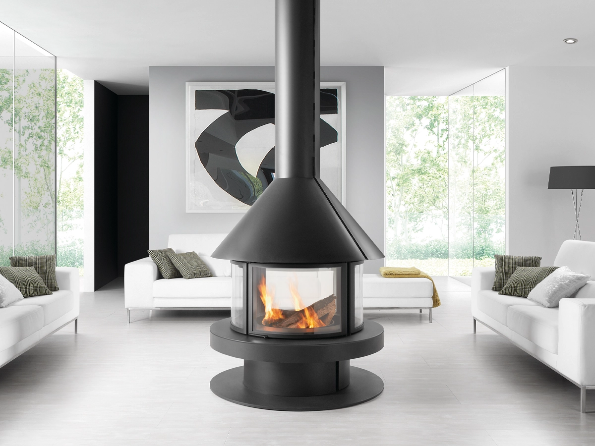Gala è un camino circolare a installazione centrale che si distingue per l'elevata efficienza energetica. Offre una visibilità completa del fuoco da qualsiasi punto della stanza.[Caminetto Rocal Gala nero, di forma circolare, con fiamma interna, al centro di un soggiorno minimalista con molta luce e tonalità chiare.]