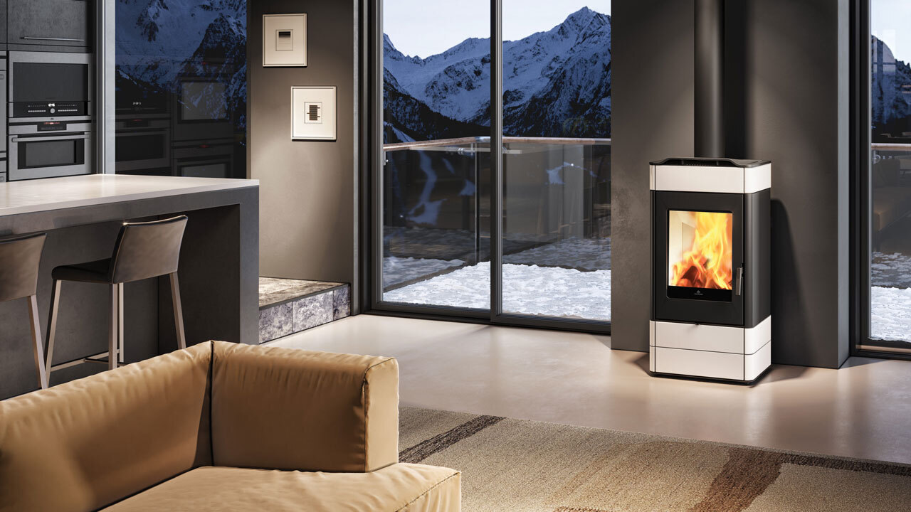 Stufa a legna rettangolare canalizzabile tramite kit optional, profondità ridotta (40 cm). Porta e top in ghisa con griglia di ventilazione integrata.