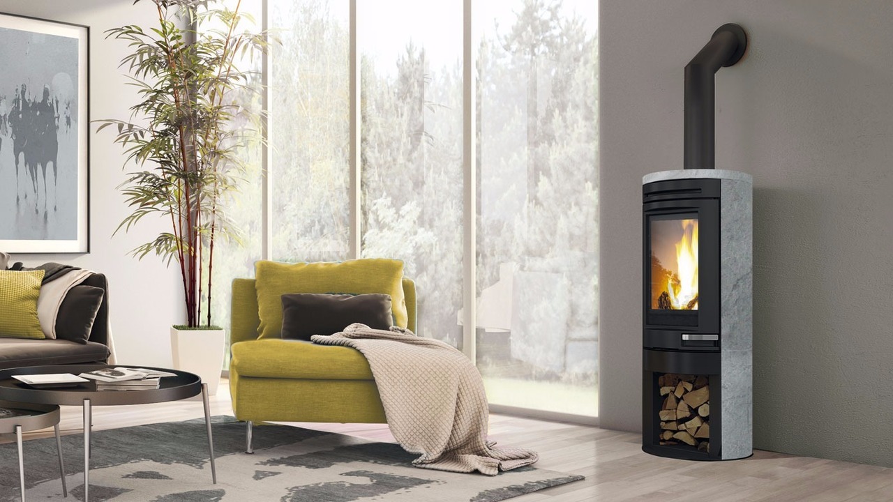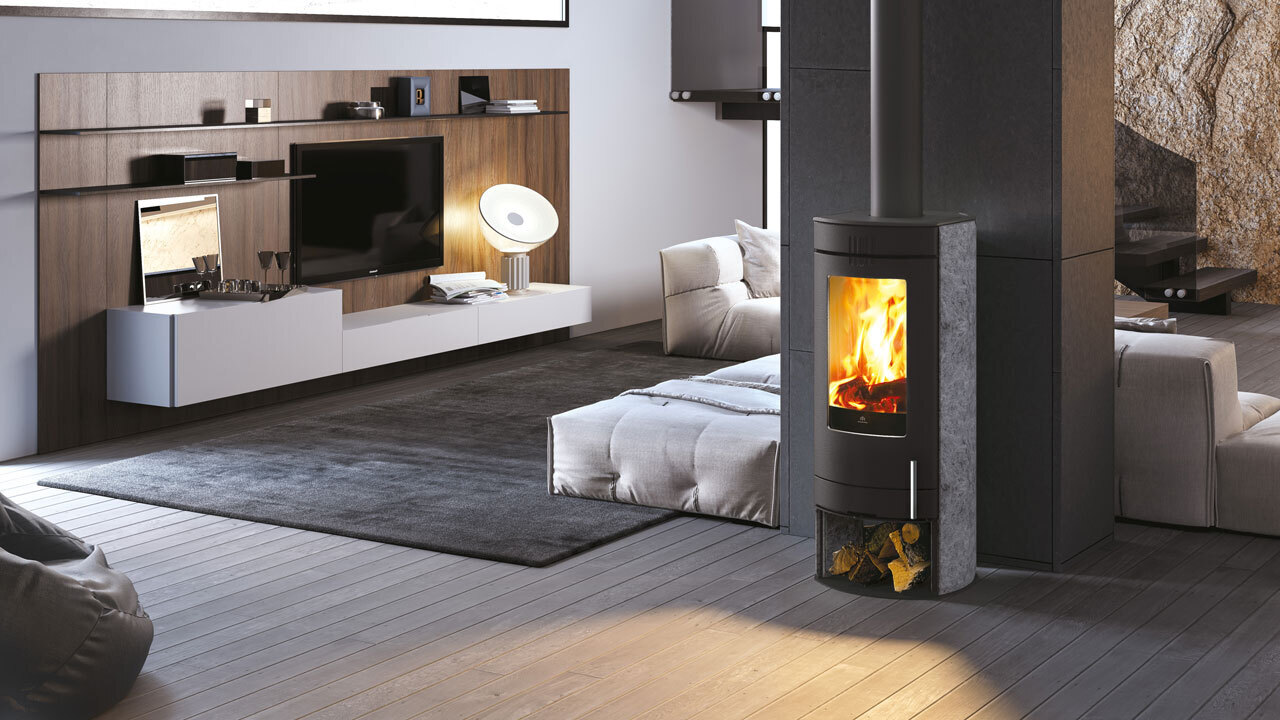 Stufa a legna Tally Evo2, con ampio vetro piano verticale che esalta il naturale andamento della fiamma. Tally Evo2 è predisposta per accumulo con kit optional: il top con anelli refrattari consente di accumulare calore e rilasciarlo in maniera prolungata anche nelle ore successive all’ultima carica di legna.