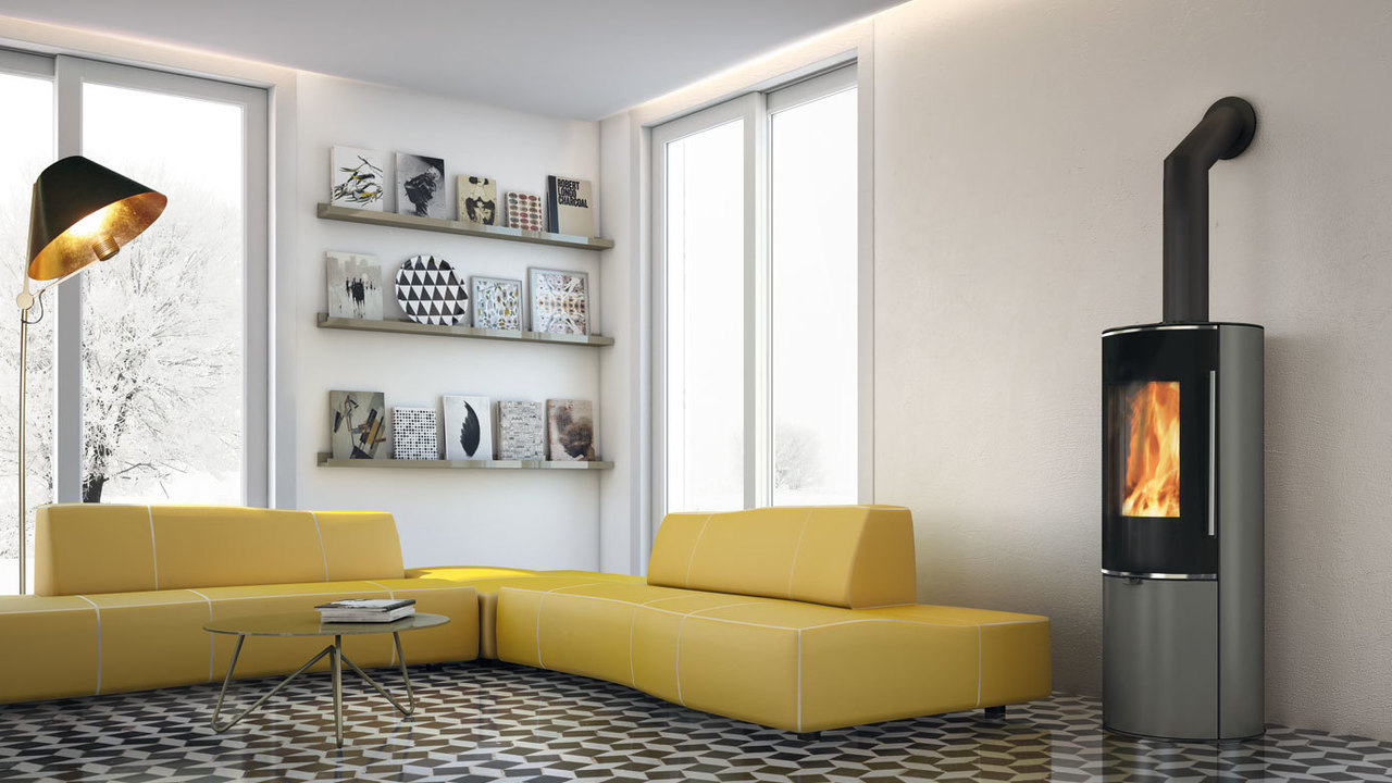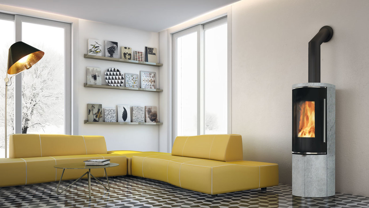 Stufa a legna Tally GL Evo2, con ampio vetro tondo che esalta la visione della fiamma. Tally GL Evo2 è predisposta per accumulo con kit optional: il top con anelli refrattari consente di accumulare calore e rilasciarlo in maniera prolungata anche nelle ore successive all’ultima carica di legna.