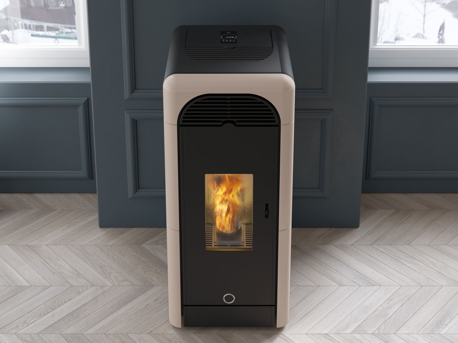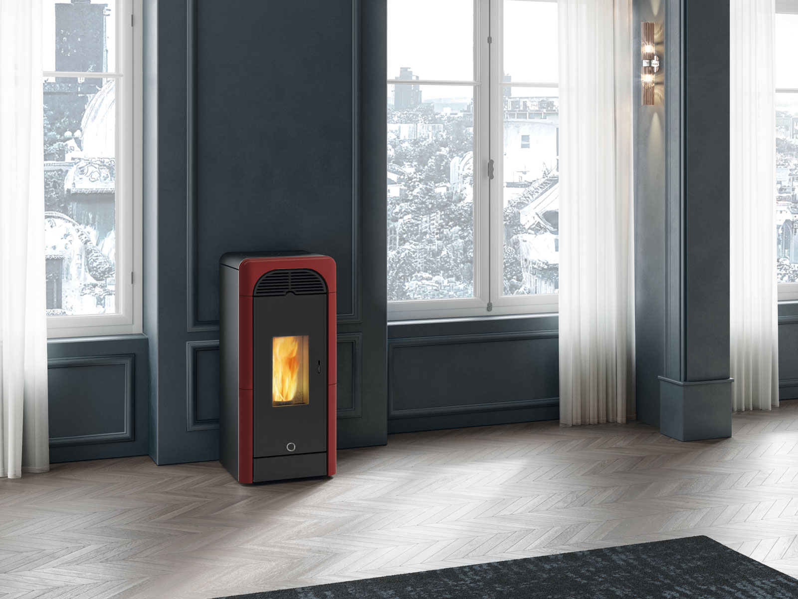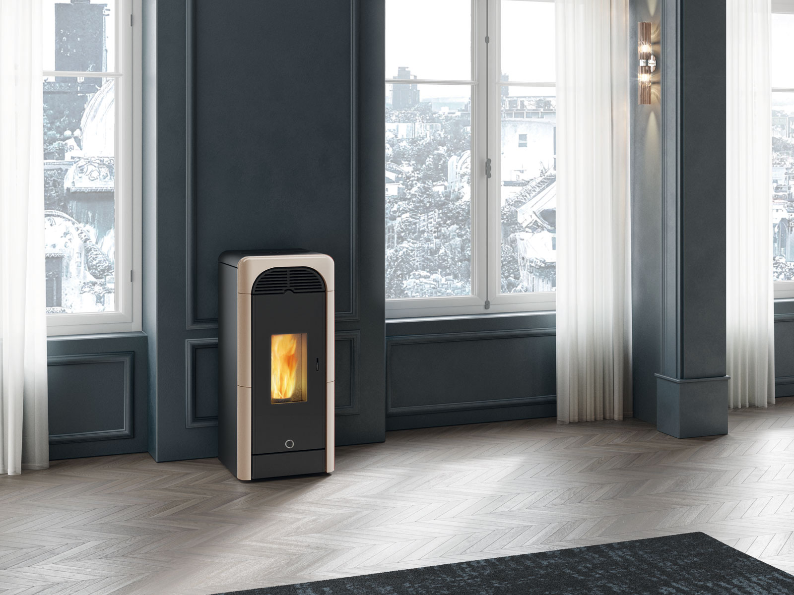Stufa a pellet stagna canalizzabile con inserti laterali e frontale in ceramica ad effetto “cornice” e con porta in ghisa.