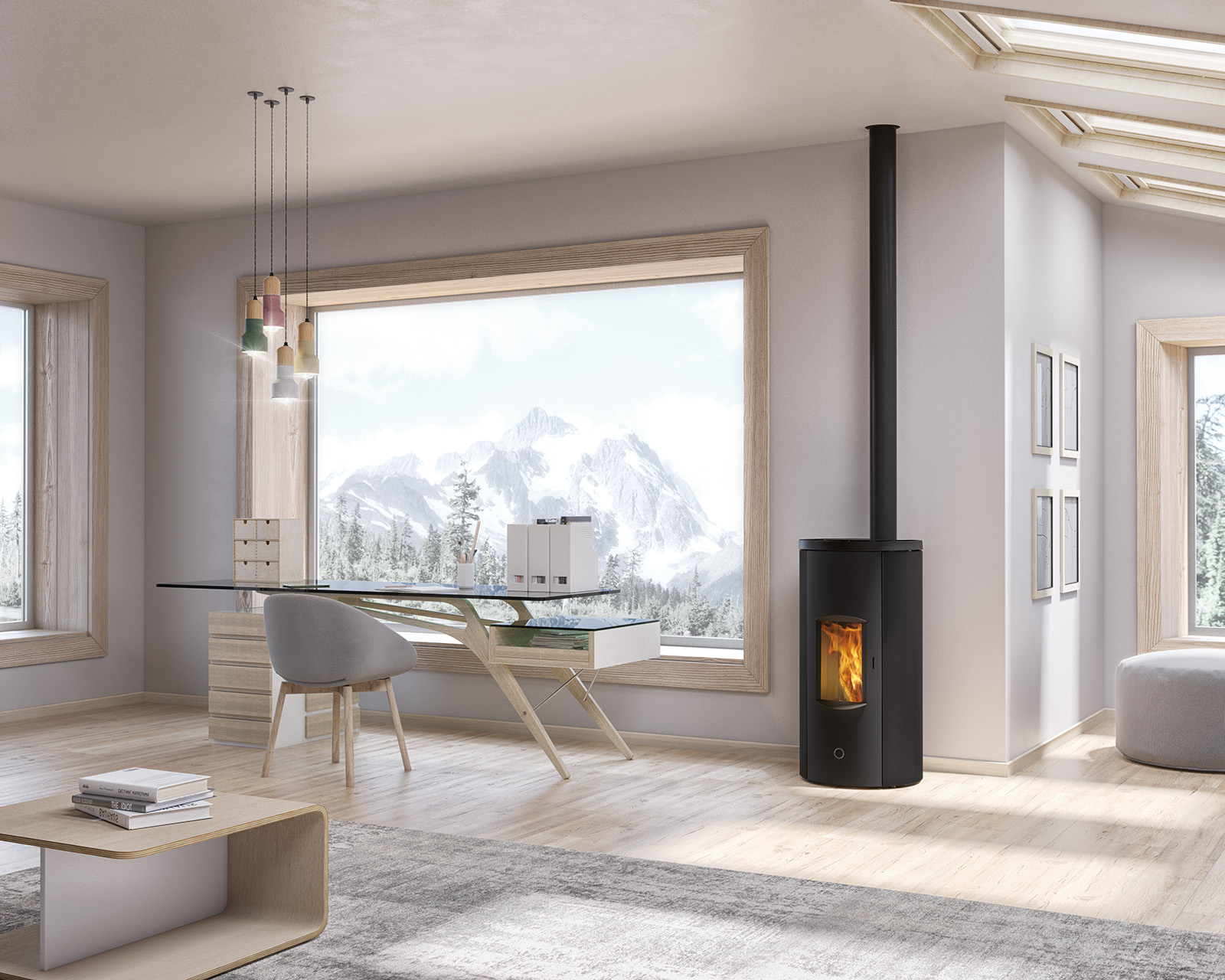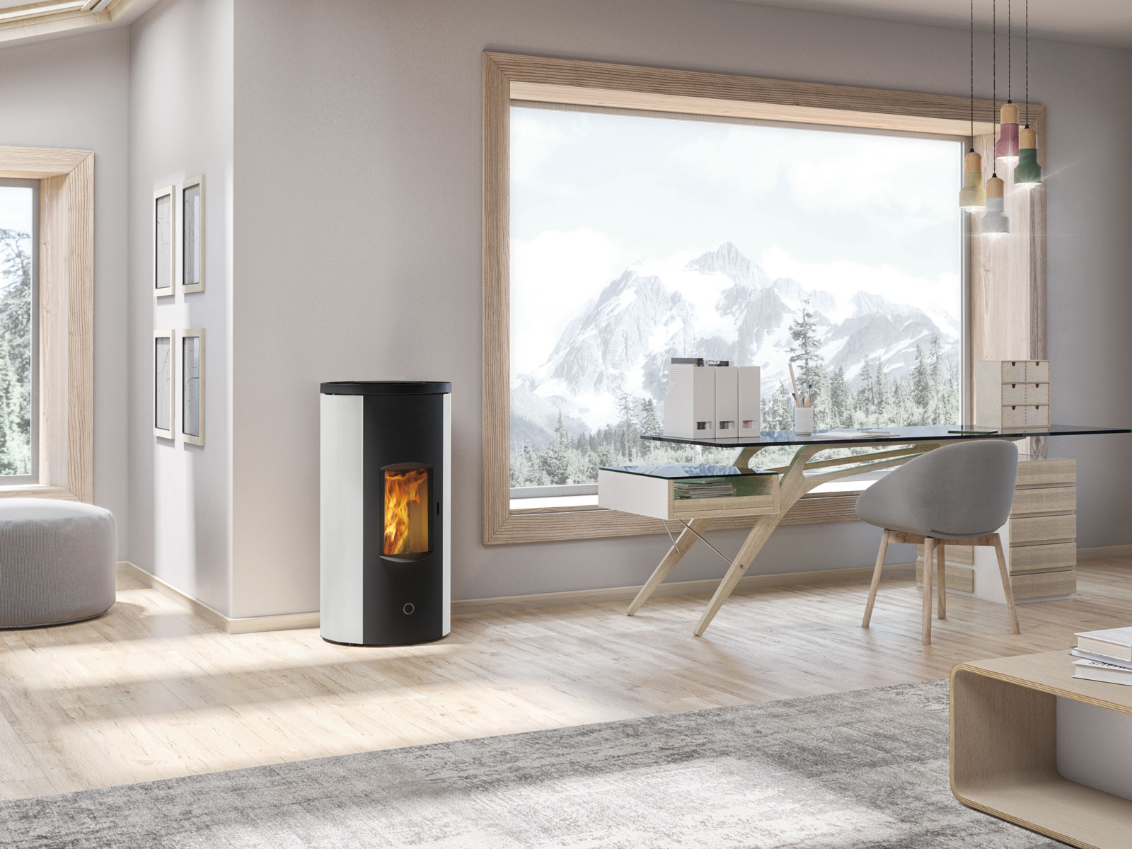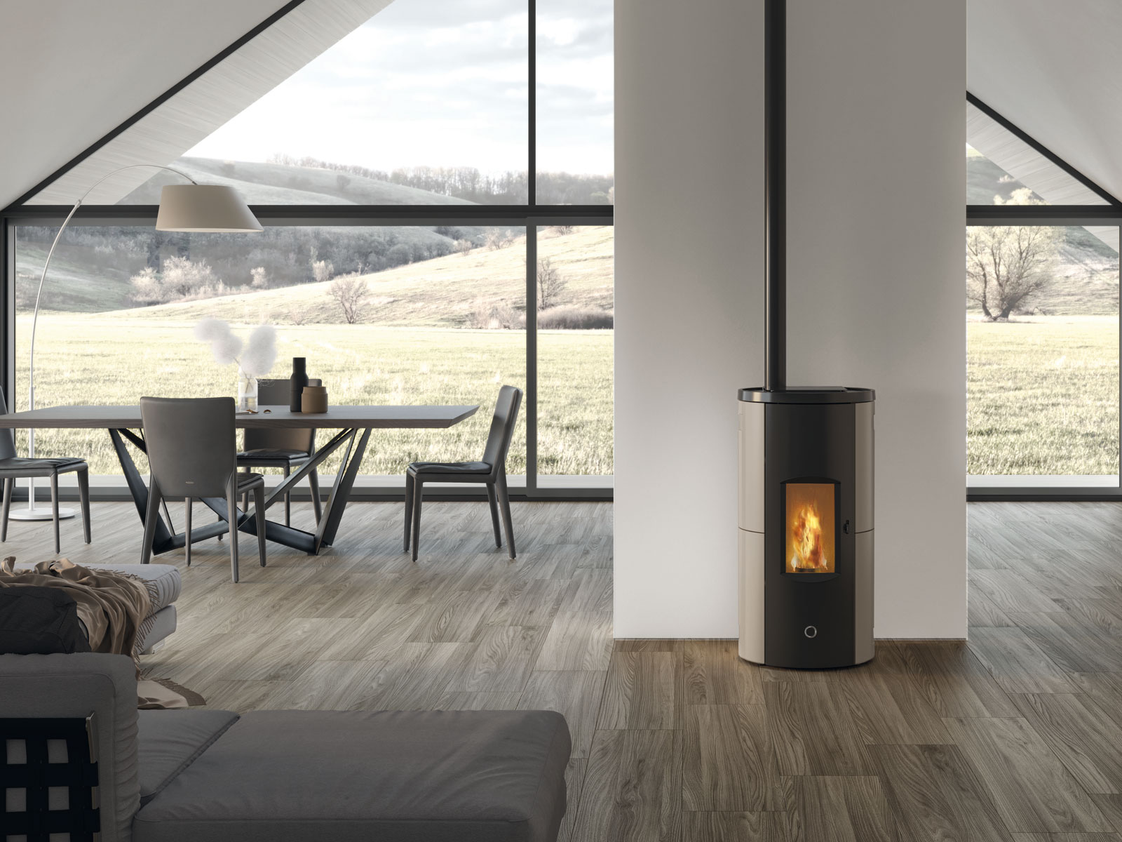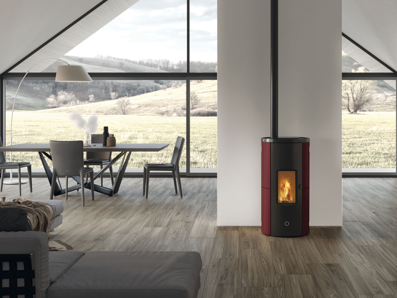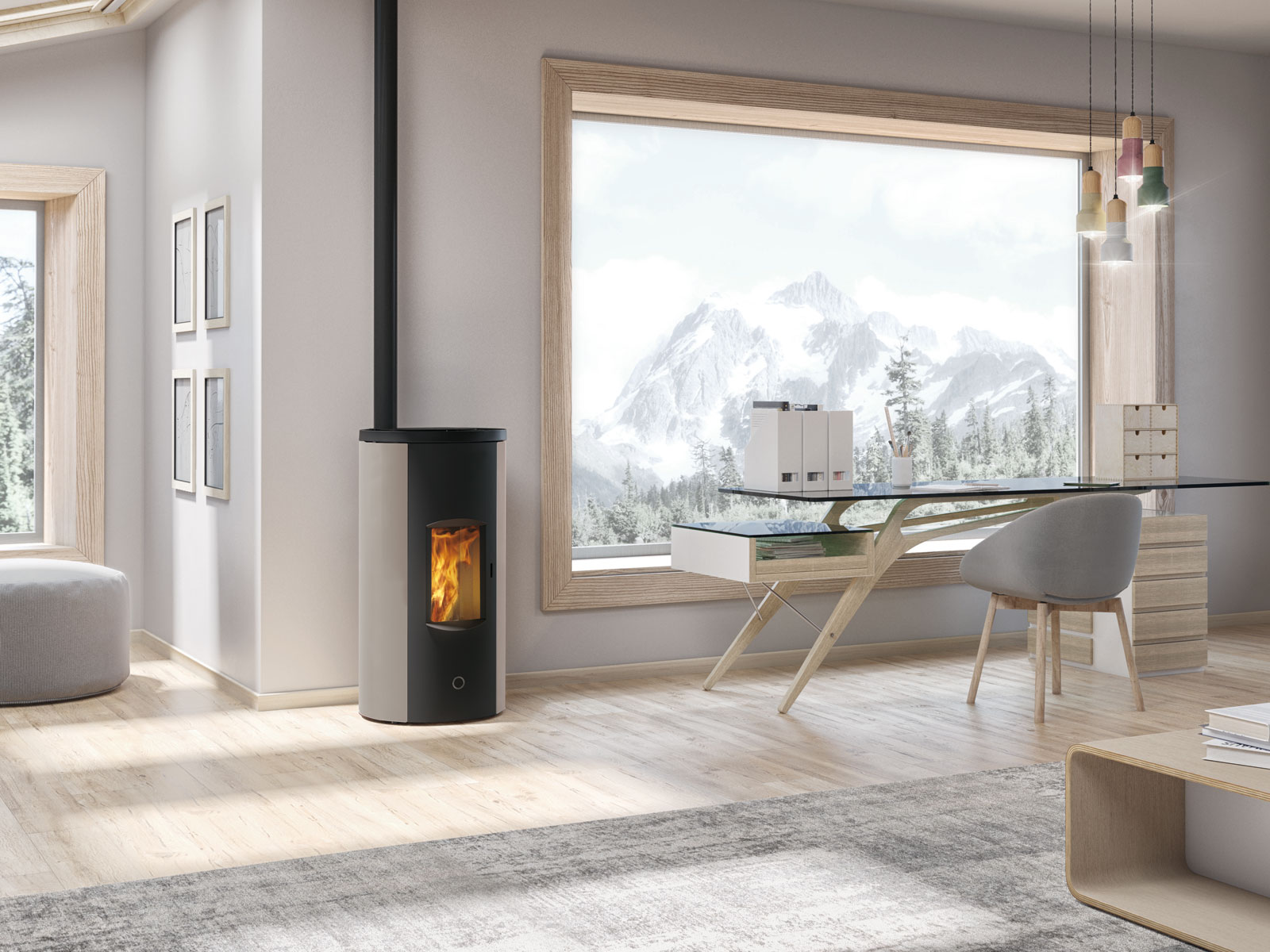 Stufa a pellet stagna a sezione rotonda con porta curva in acciaio e vetro piano. La porta, priva di griglie, e i fianchi presentano decorazioni in bassorilievo.