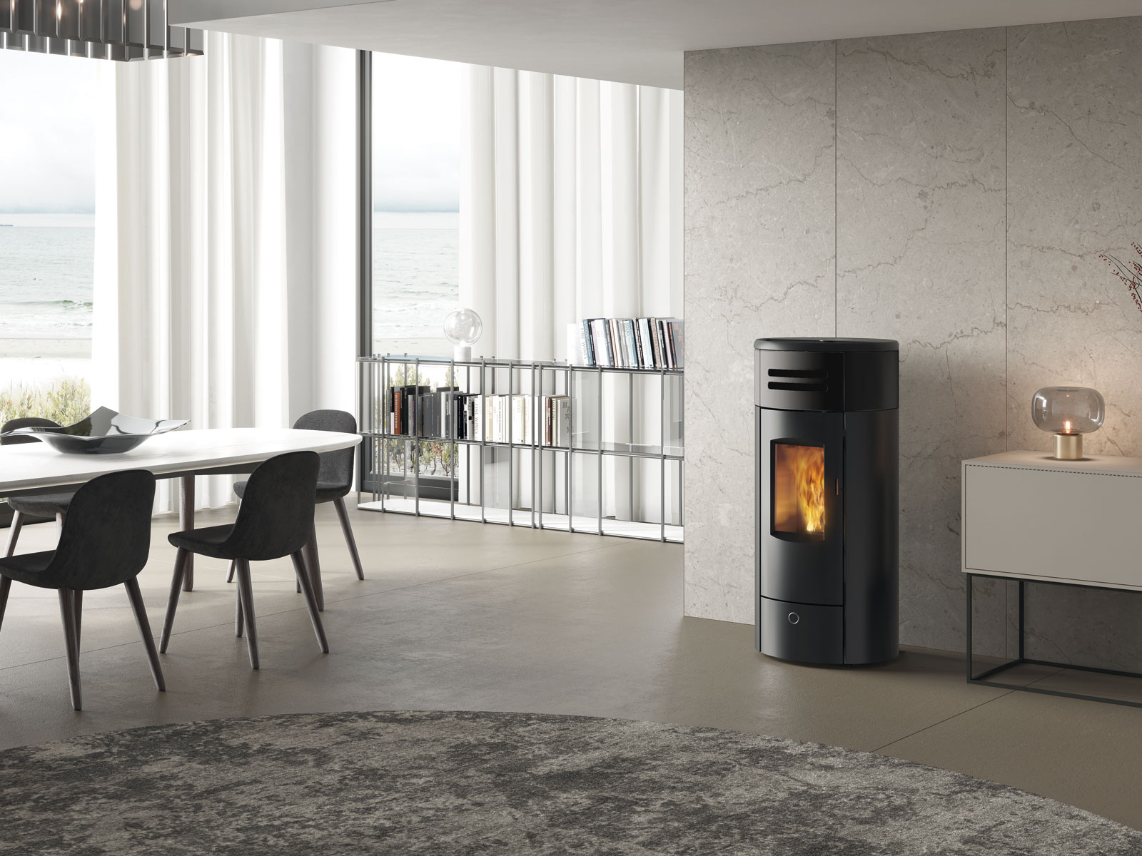 Stufa a pellet stagna canalizzabile a sezione rotonda, dalla linea slanciata. Con porta in ghisa, fianchi in acciaio e inserto frontale in ceramica.