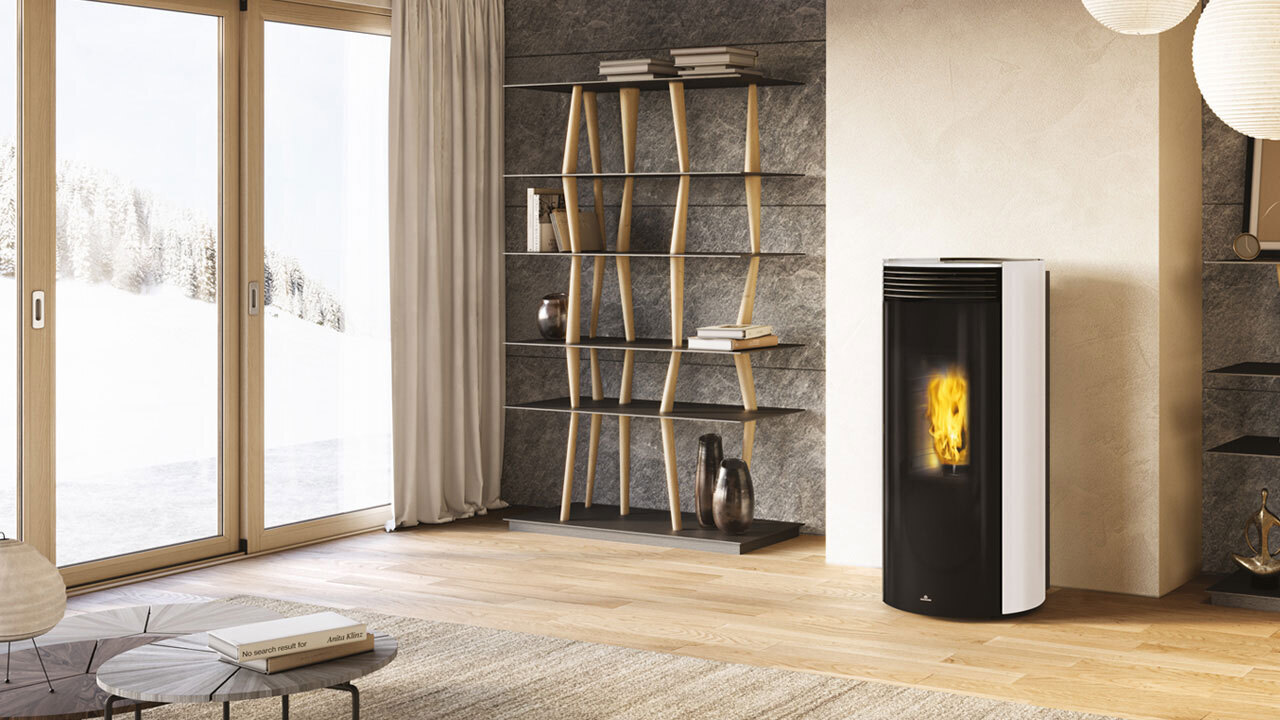 Stufa a pellet dal design essenziale e raffinato. Il vetro “Magic” totalmente nero rende visibile la fiamma ma nasconde il focolare quando è spento, per un design sempre elegante.