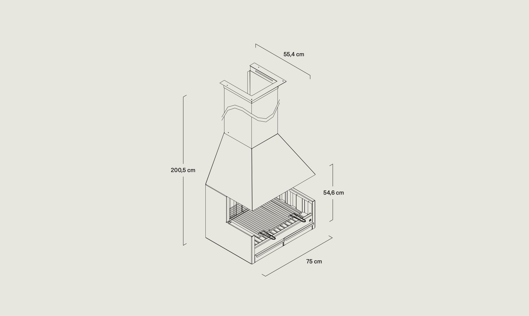 Realizzata in acciaio inossidabile, la Palma 75 garantisce affidabilità per durare tutta la vita. Questo barbecue progettato per essere posizionato su un portico risulta ideale per cucinare in spazi esterni coperti, consentendo una buona evacuazione dei fumi e un ottimo controllo del fuoco.[Barbacoa Palma 75 inox porche de Rocal negra, en una pared lisa gris en porche con techo de madera]